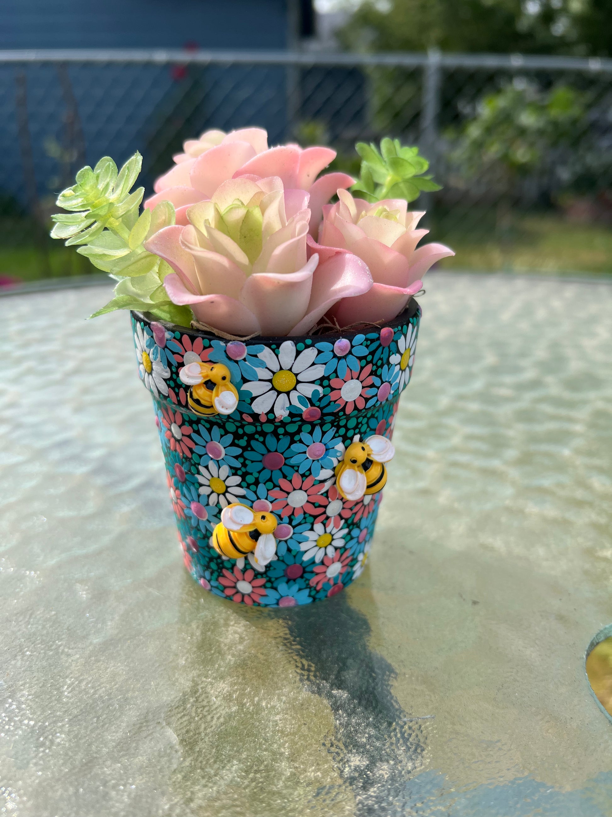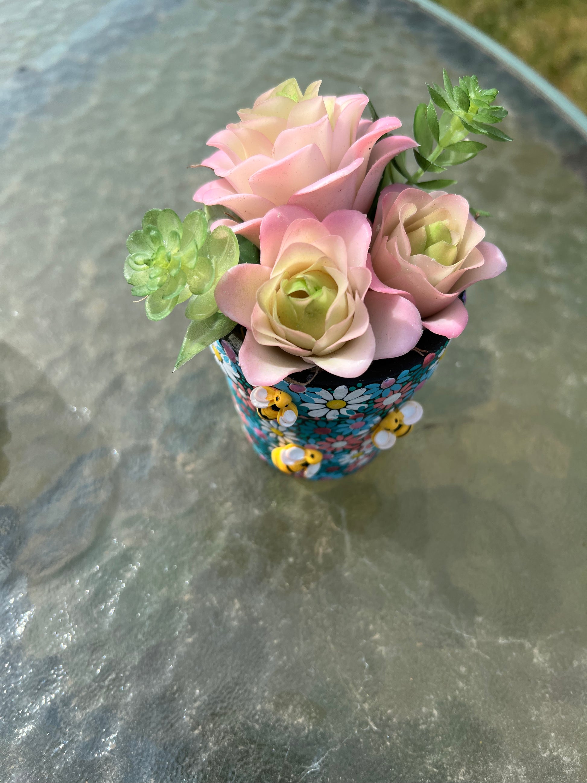 This is a hand painted 3” pots. Has faux succulents and cute little bee’s.