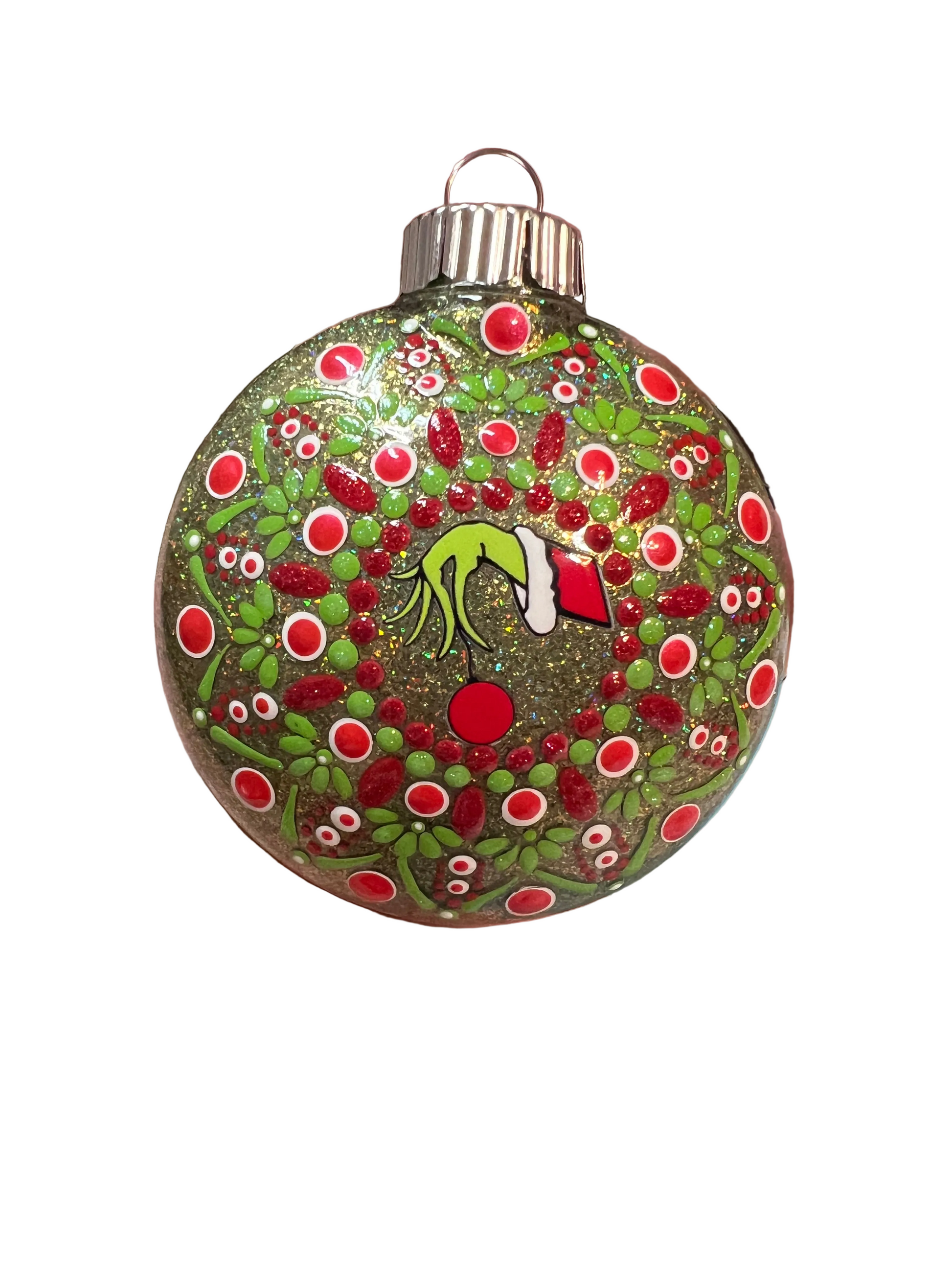 3 inch round plastic ornament. Decal in center and I painted around the decal. Has a clear coat on top.