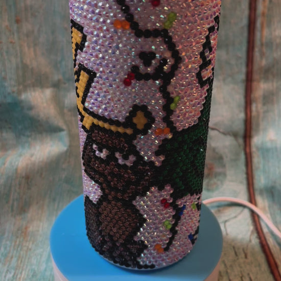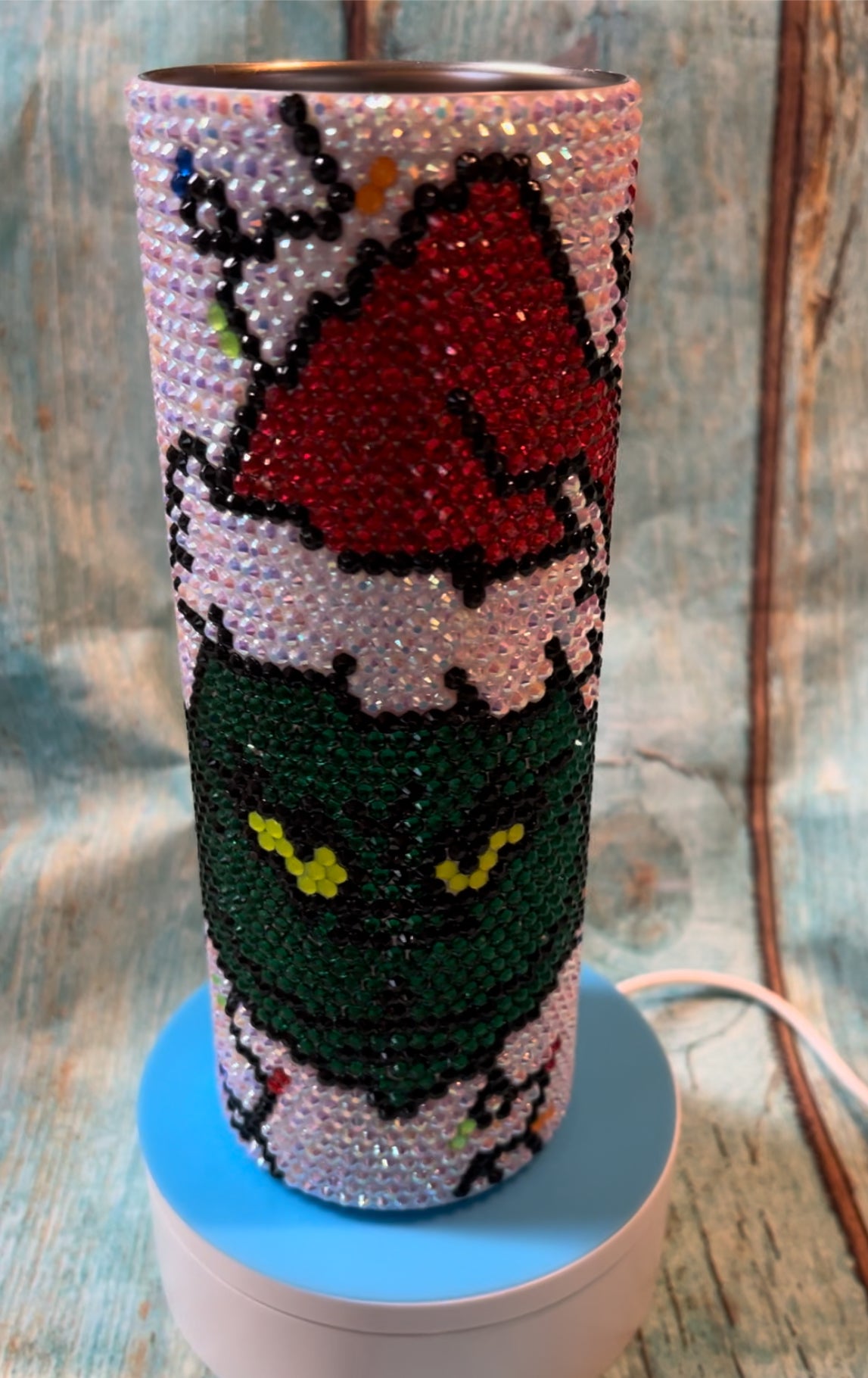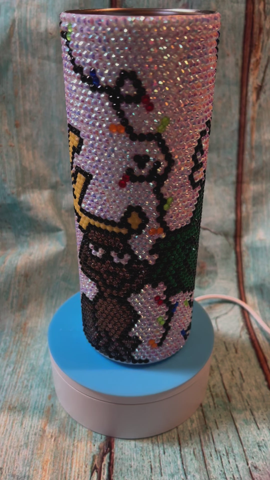 This is a 20oz tumbler with resin rhinestones. Comes with a lid and metal straw. Care instructions included.