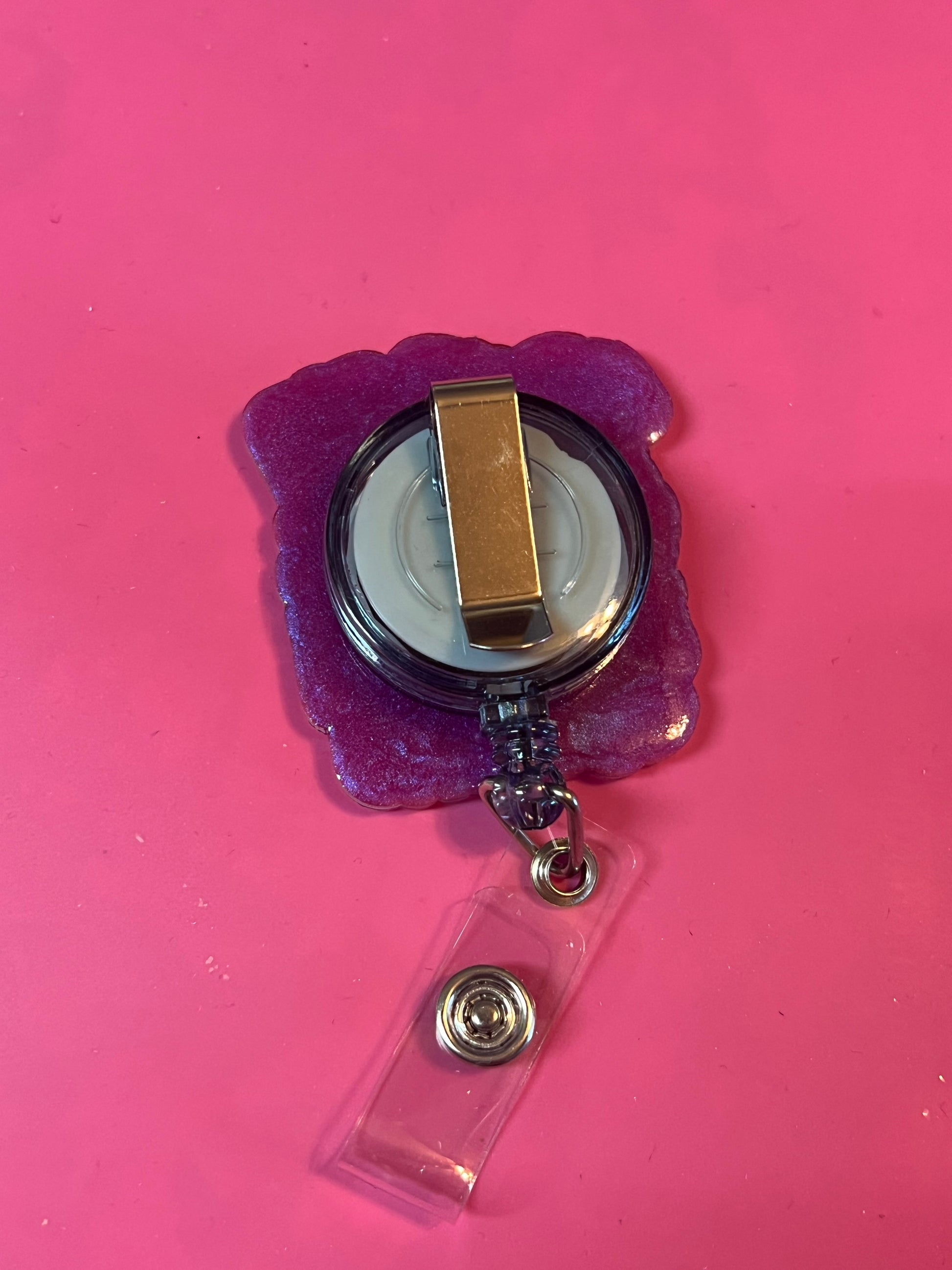 Acrylic badge reels. Made with resin, mica powder and a UV-DTF decal.