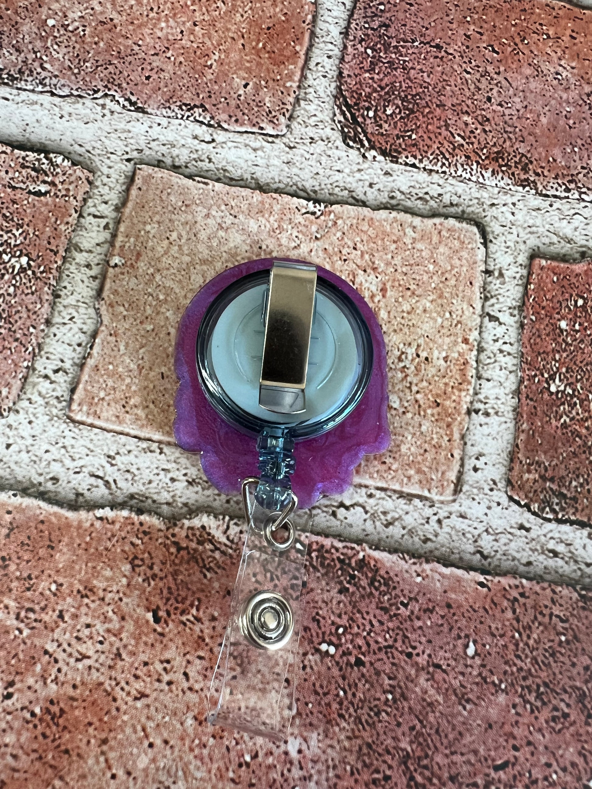 Acrylic badge reel. Made with resin, mica powder and a UV-DTF decal.