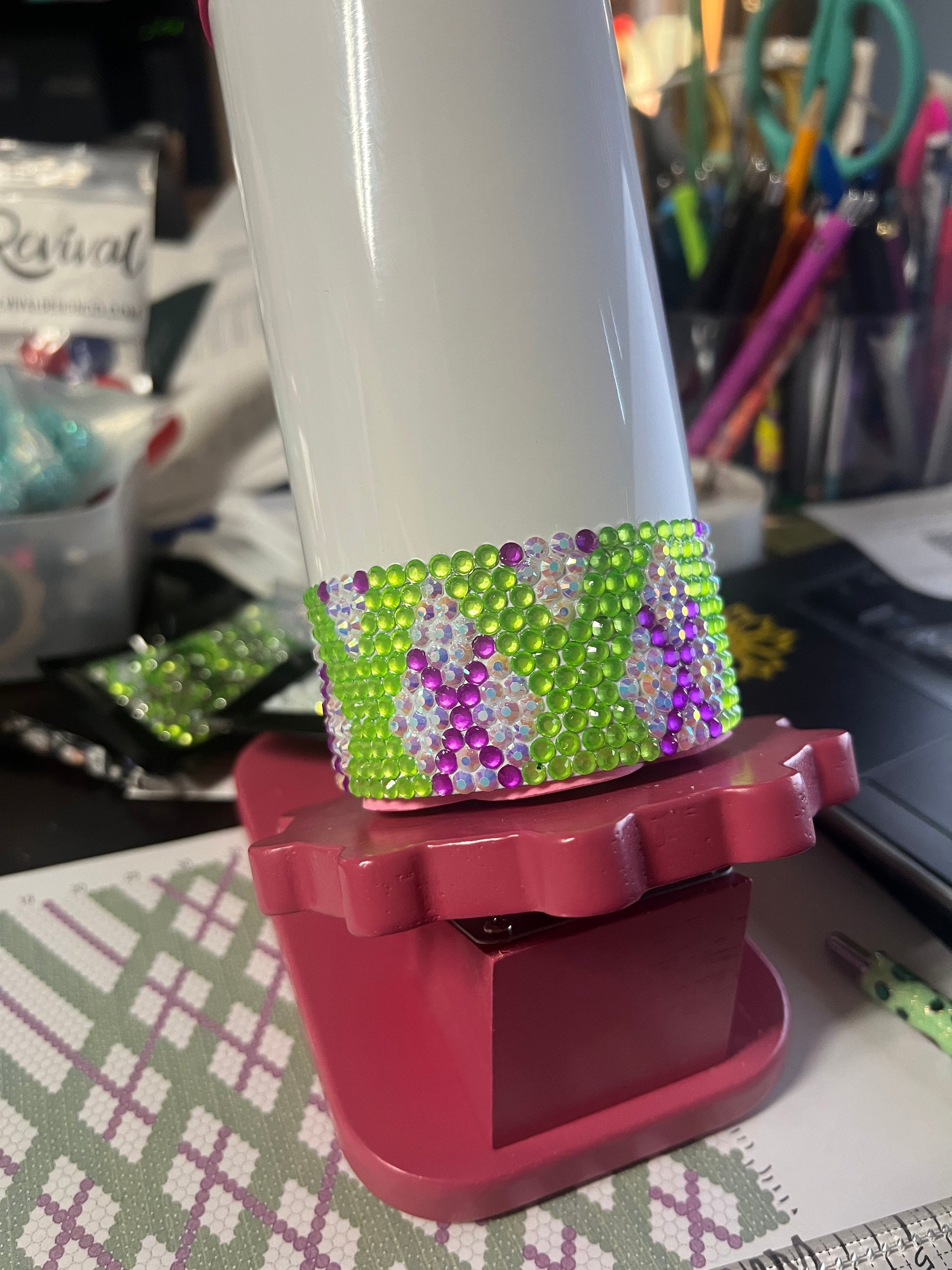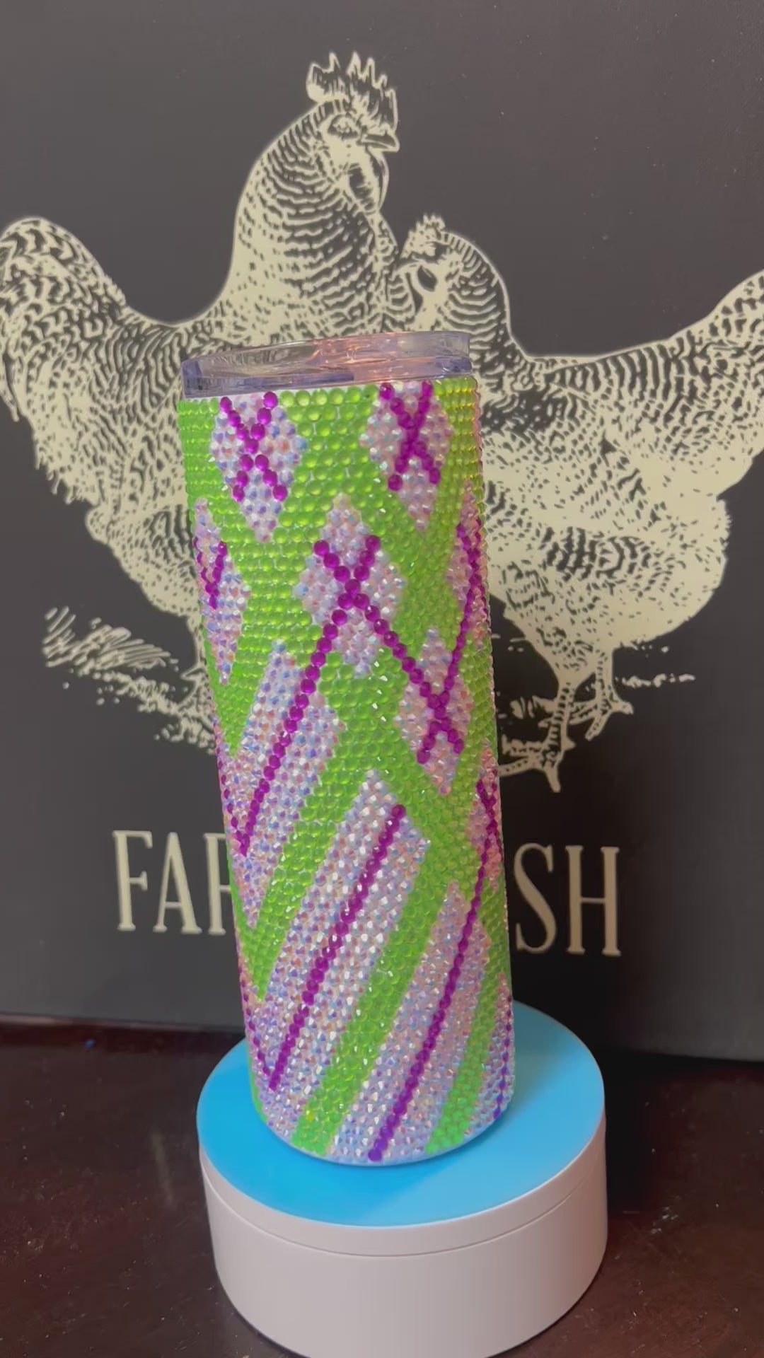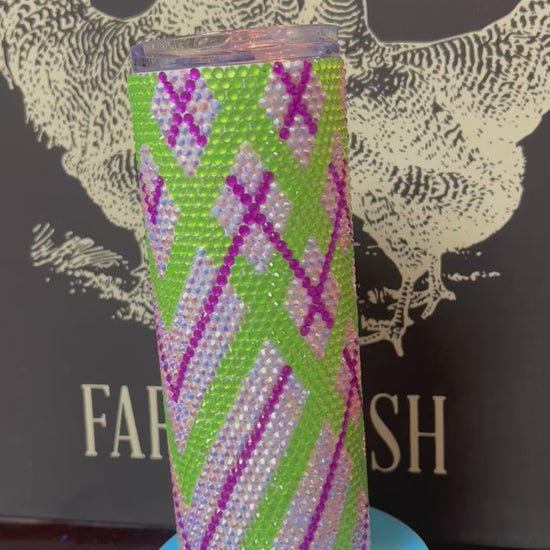 This is a 20oz skinny tumbler and has over 2,000 rhinestones. Comes with a lid and a straw.