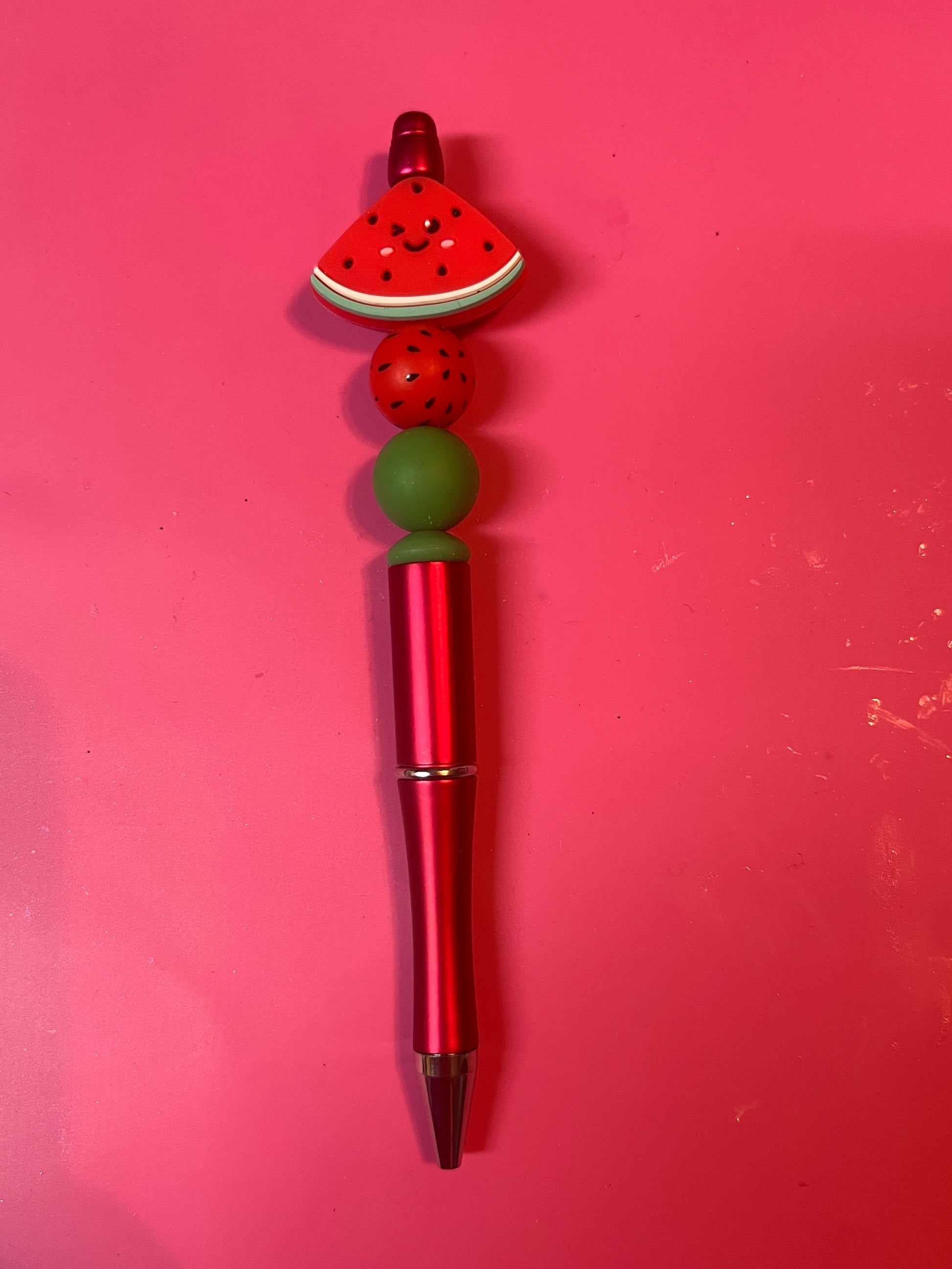 Beaded pen with a watermelon theme. Comes with black ink and a refill.