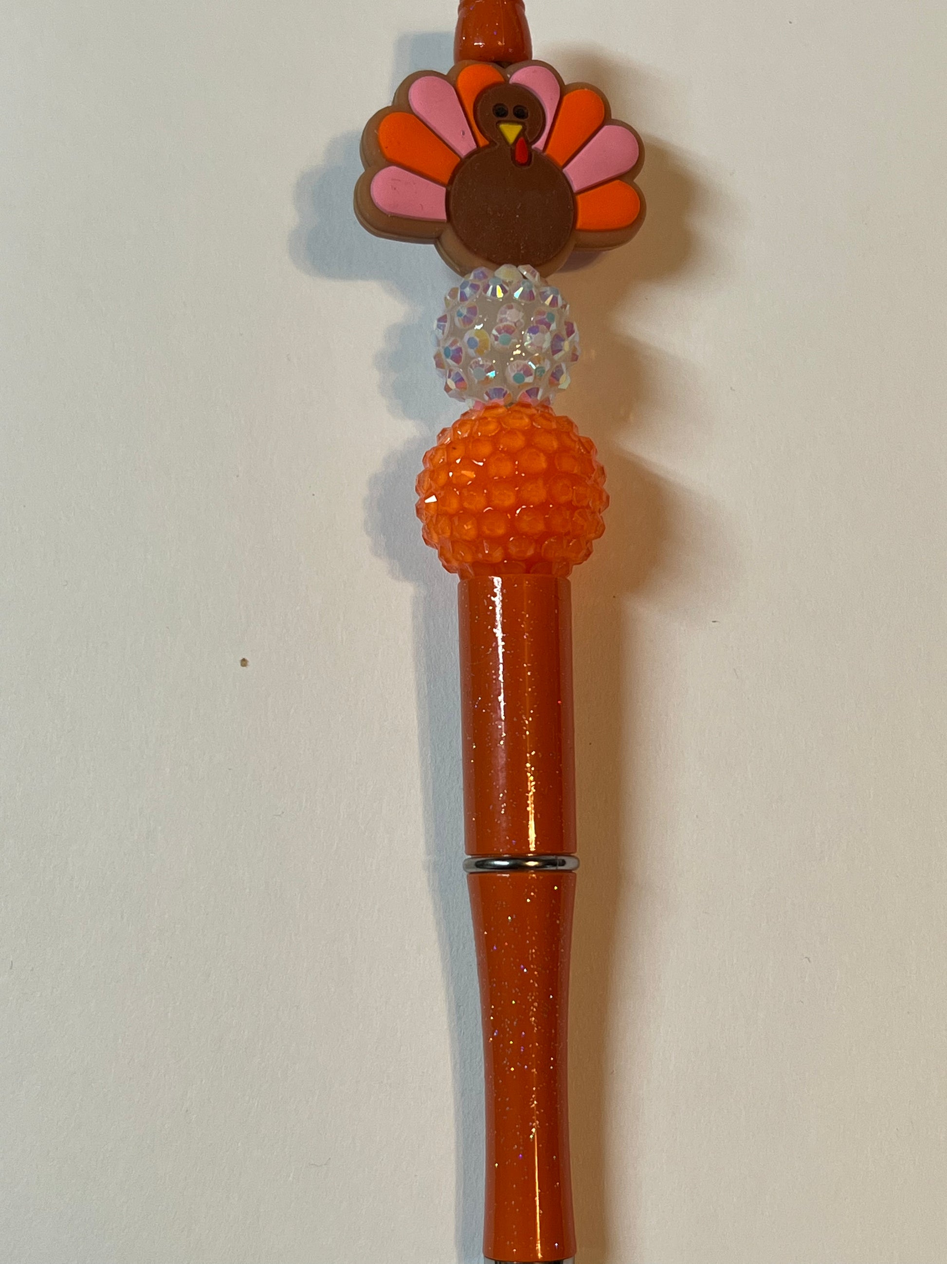 Pen has rhinestone beads and a silicone turkey. Has black in and comes with 1 refill.